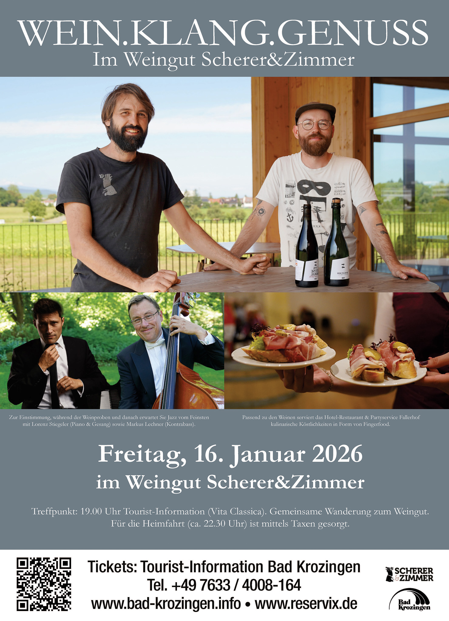 Ein besonderer Genussabend erwartet die Gäste am Freitag, 16. Januar 2026, um 19 Uhr bei der Veranstaltung „Wein.Klang.Genuss.“ im Weingut Scherer & Zimmer in Bad Krozingen. Die beiden Jungwinzer Felix Scherer und Michael Zimmer geben dabei Einblicke in ihre Arbeit, ihre Philosophie und ihre Weine. Musikalisch begleitet wird der Abend von Markus Lechner am Kontrabass und Lorenz Stiegeler am Piano, die mit fein abgestimmten Jazzklängen für eine stimmungsvolle Atmosphäre sorgen.